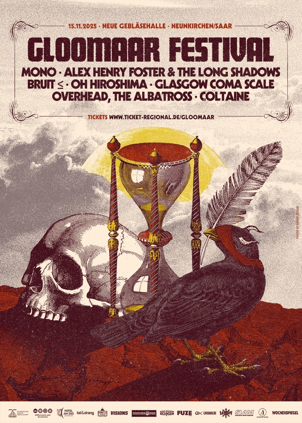 Am Samstag, dem 15. November, ab 14:30 Uhr findet zum achten Mal das international renommierte GLOOMAAR FESTIVAL mit Mono (JPN), Alex Henry Foster & The Long Shadows (CAN), Bruit ≤ (FRA), Oh Hiroshima (SWE), Glasgow Coma Scale (GER), Overhead, The Albatross (IRL) und Coltaine (GER) in der Neuen Gebläsehalle in Neunkirchen statt.